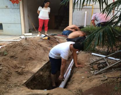 得知情況后,小區(qū)維修組立刻組織人員前往現(xiàn)場,根據(jù)踏勘,分析為地下管網(wǎng)問題,需要開挖進(jìn)一步確定?梢驑乔皡^(qū)域狹小,不便使用機(jī)械,只能人力開挖。