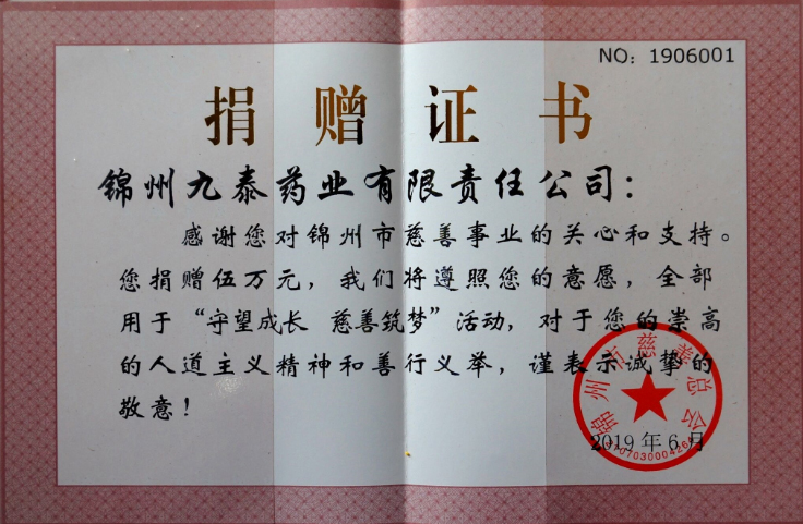 錦州慈善總會授予公司優(yōu)秀慈善贊助單位稱號