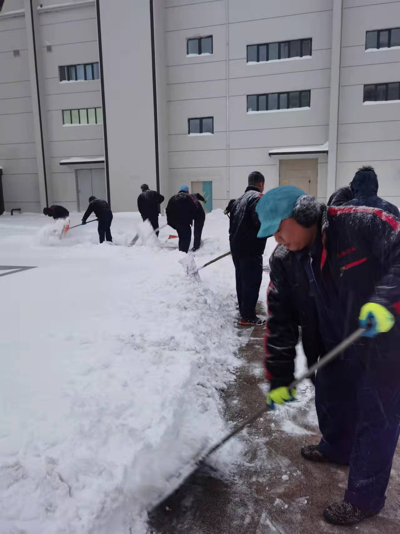 面對公司廠區(qū)內(nèi)的積雪,為了保證明天上班后的順利開工,九泰人沒有等靠,公司行政部郭春風副總經(jīng)理積極安排布置,通知包裝中心、運輸班、綠化班、食堂的部分員工步行來到了公司,對公司院內(nèi)主要道路以及通往食堂沿街路面的積雪進行清掃。